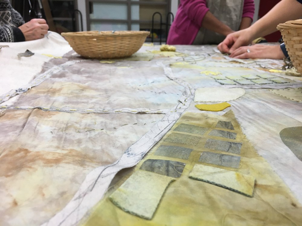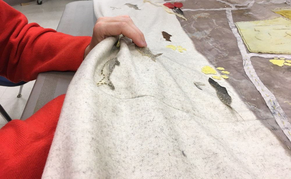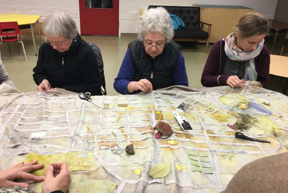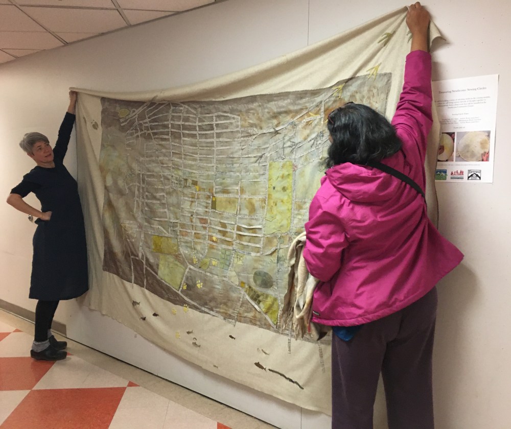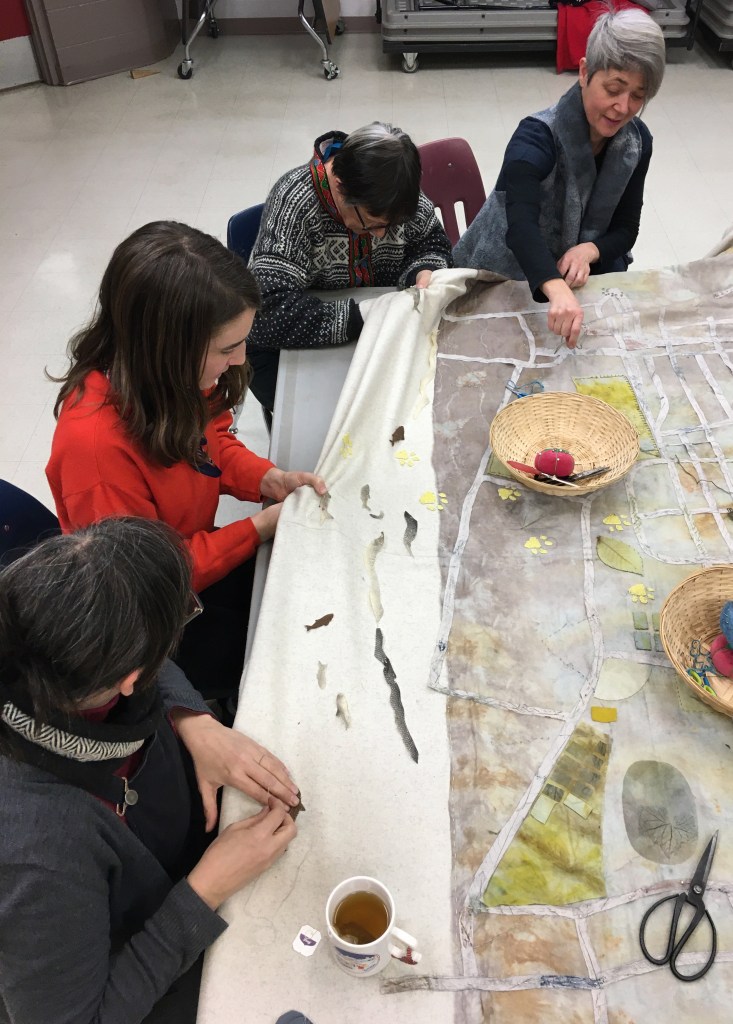 The idea of mapping Strathcona in this way came out of conversations that were had over the course of the year, dialogues that explored how cartographies might be reimagined. The project evolved organically from the starting point of community asset mapping (ideas of maps and notes on paper), to painting and imagining “in the long ago” on wood (with Janey Chang and Jay Peachy), and celebrating the present with a mural on the shipping containers created by Alex Ramirez and the Summer Heat youth group. The final piece in this project, a textile map, is another iteration of these ideas, our intention being to reflect the many histories that are held in this vibrant place, a mingling of plant and animal presence alongside human life.