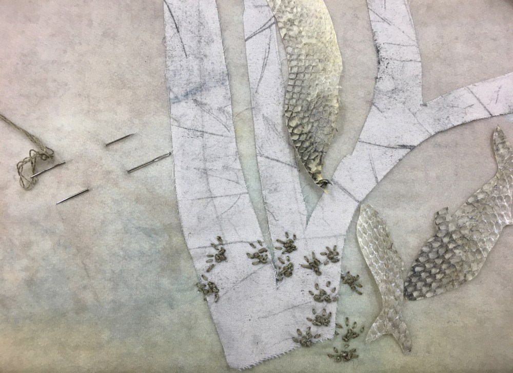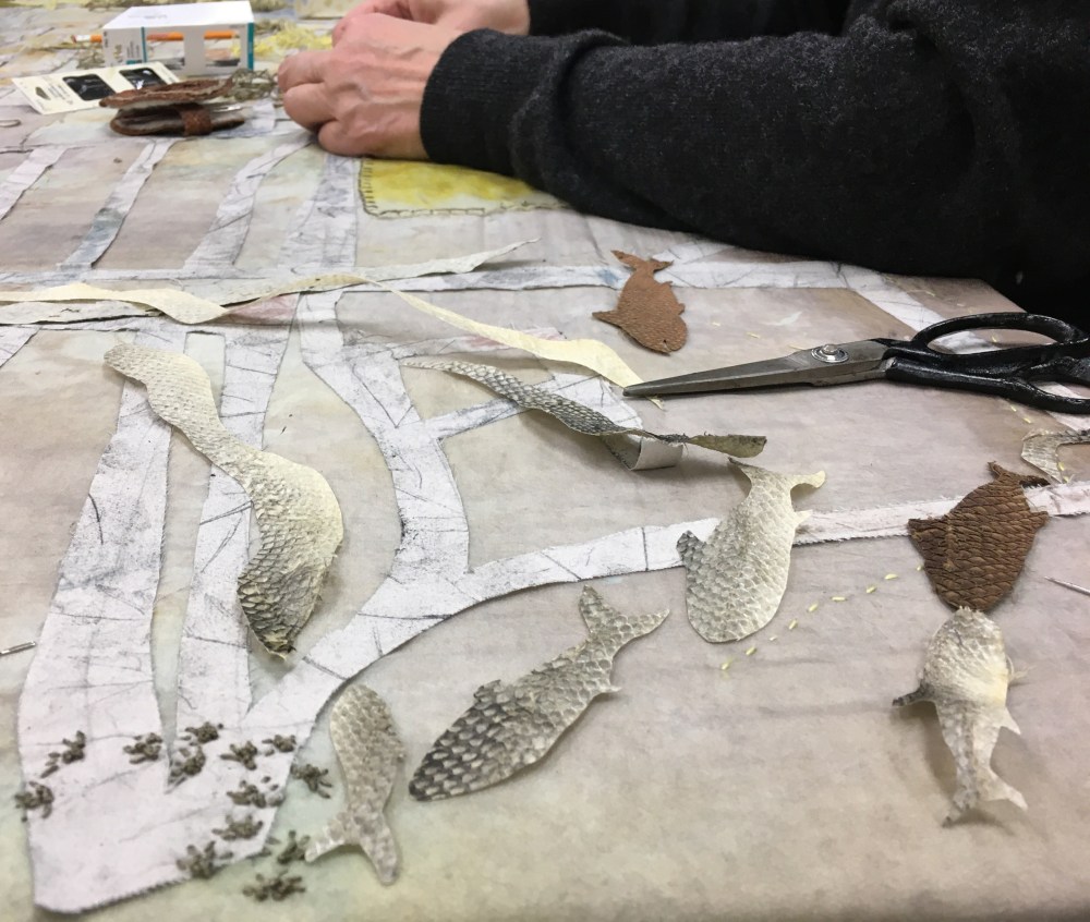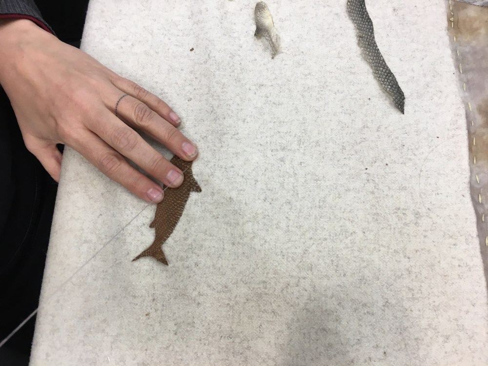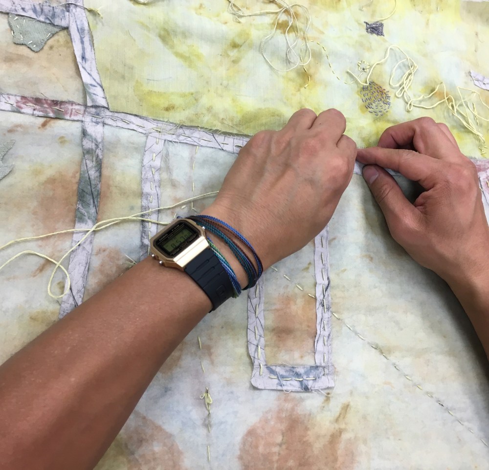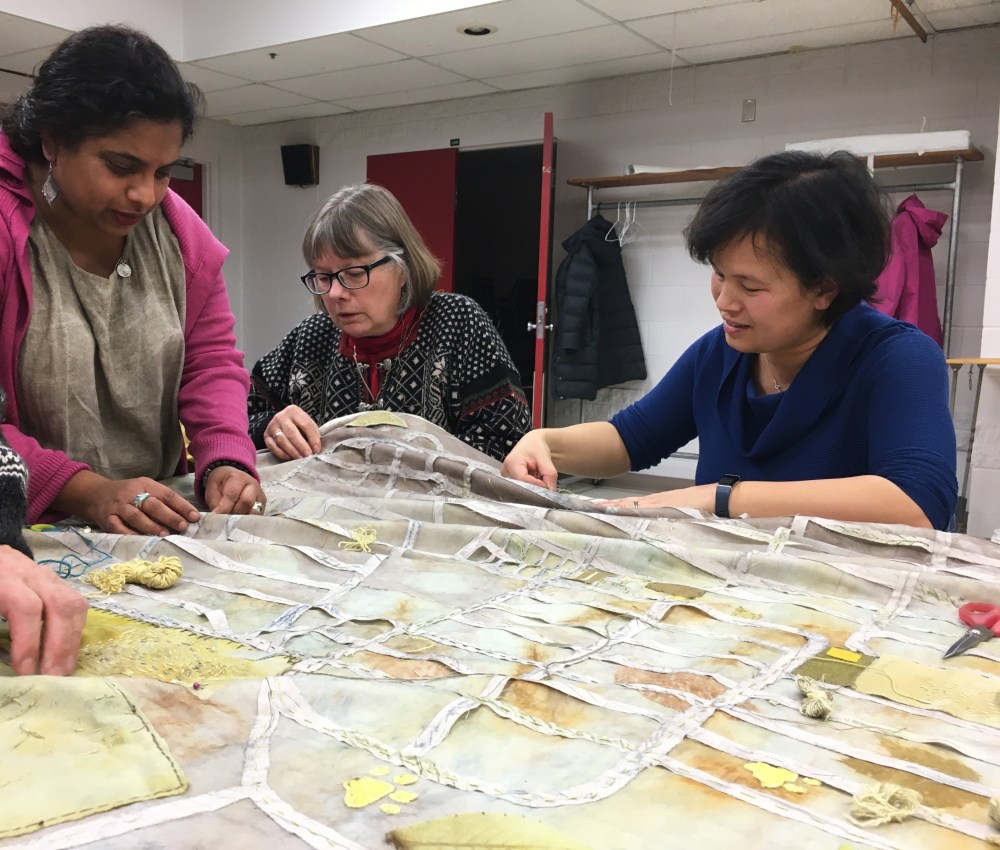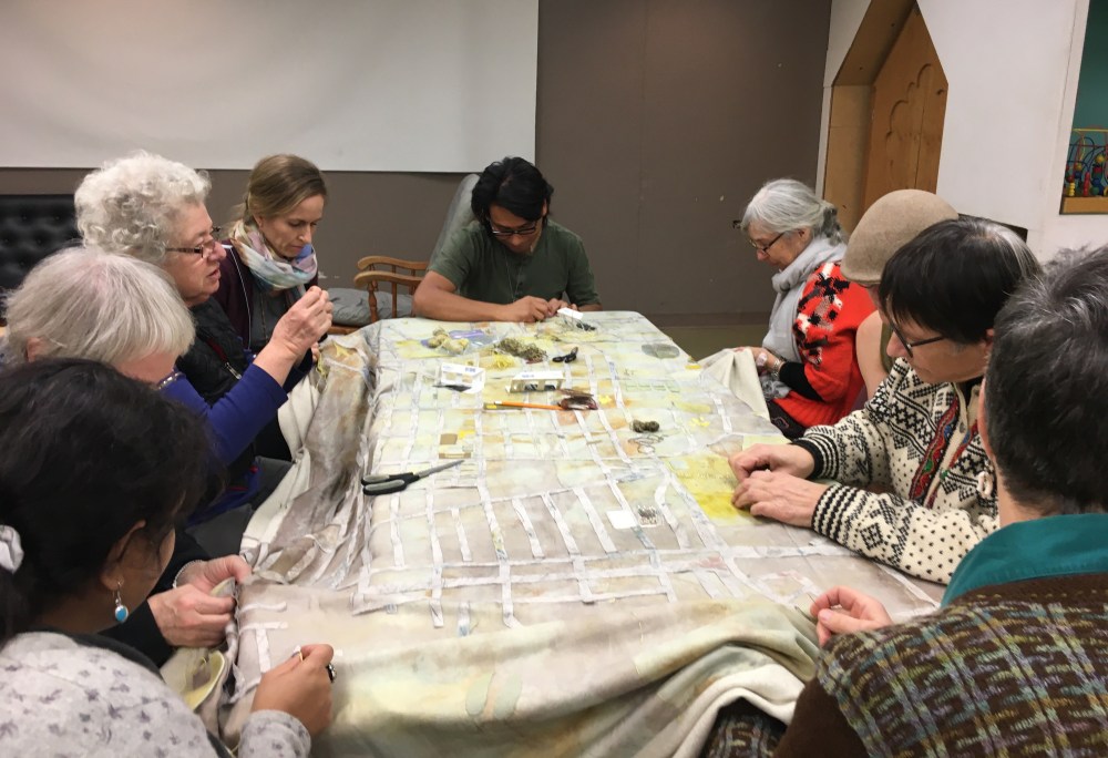 Over the past 6 weeks we have been working together to create a collaborative textile artwork that will live at the community centre after our 2019 residency is completed. The piece is made from layers of cloth that were dyed and marked (by plants growing throughout the neighbourhood) during our summer Plant & Dye walks, MacLean Park Movie Night, the Strathcona Harvest Festival and more. These cloth pieces, along with salmon skin leather made by Janey Chang, were stitched together, and sewn upon, by dozens of community members and friends to form a map of the neighbourhood.