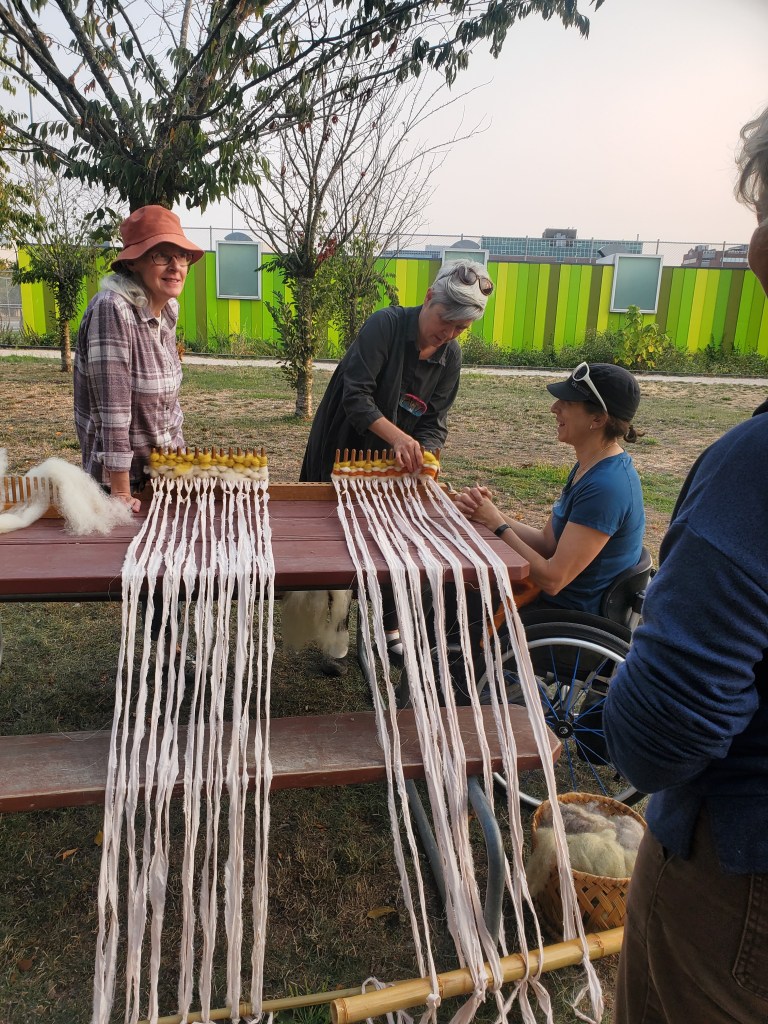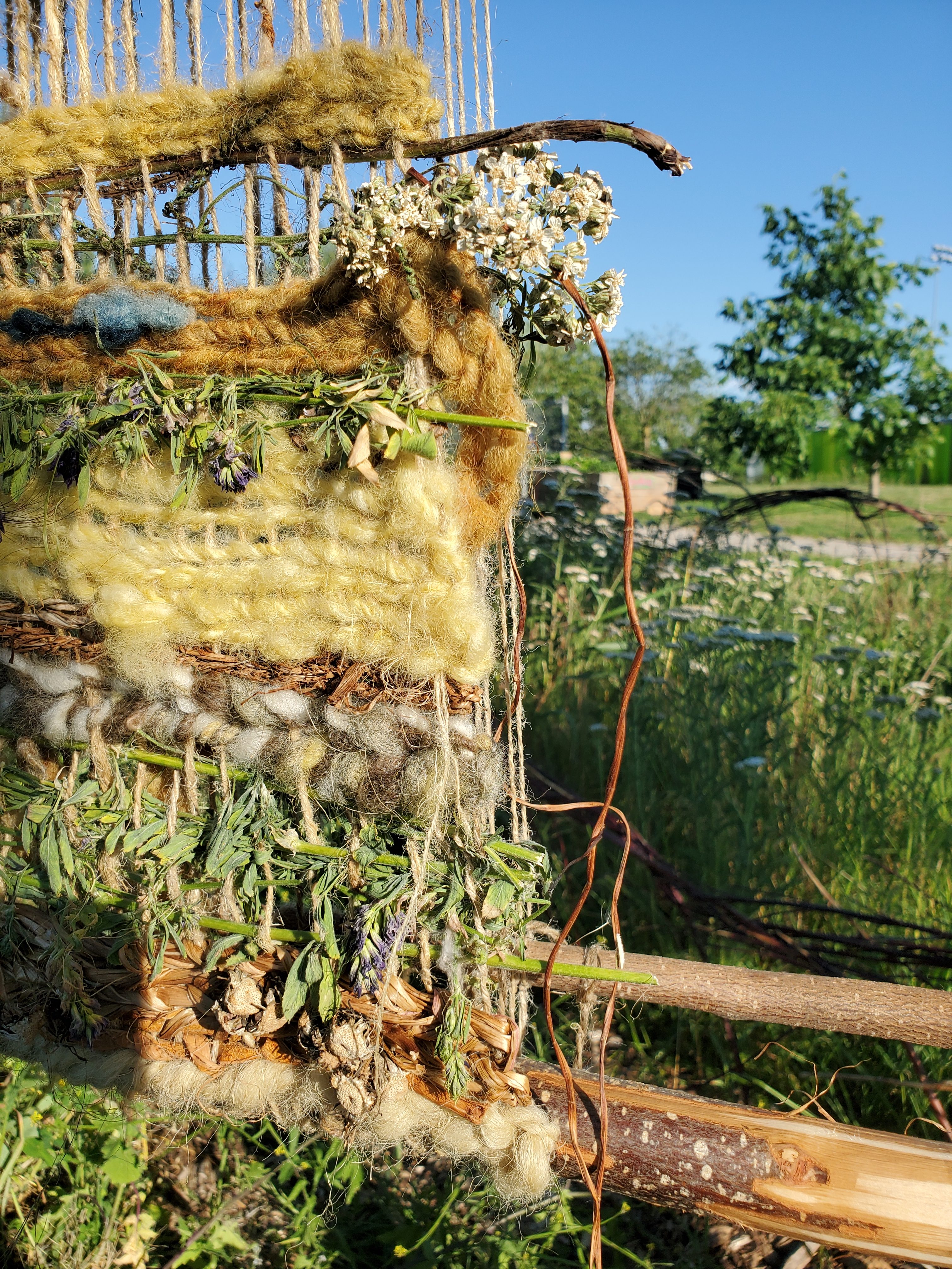 The Trillium Land Loom had a few beautiful pieces created on it by both stewards and community members working collaboratively, the loom was warped on summer solstice by our stewardship group and reactivated to finish the season at the Heart of the City festival in November.