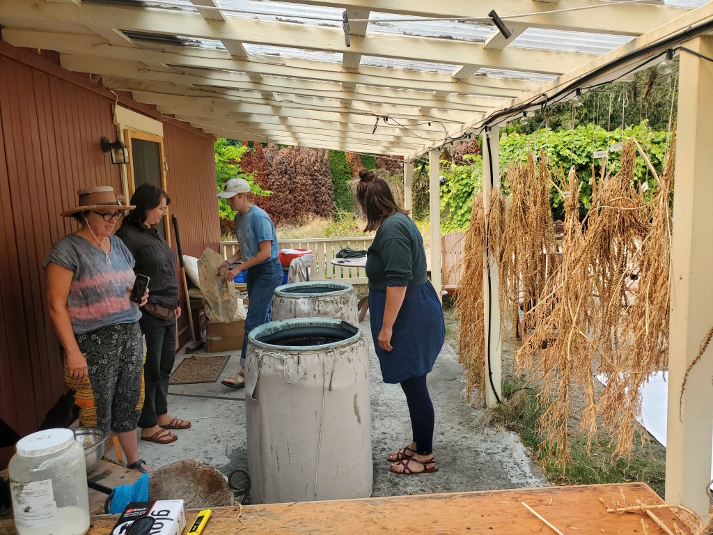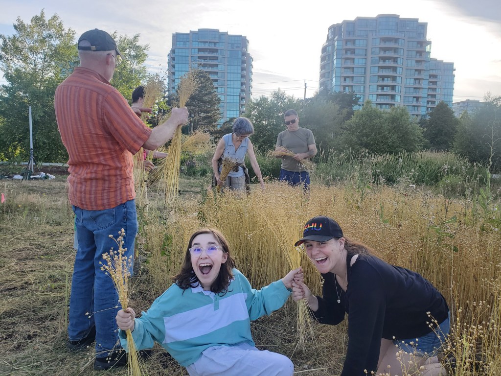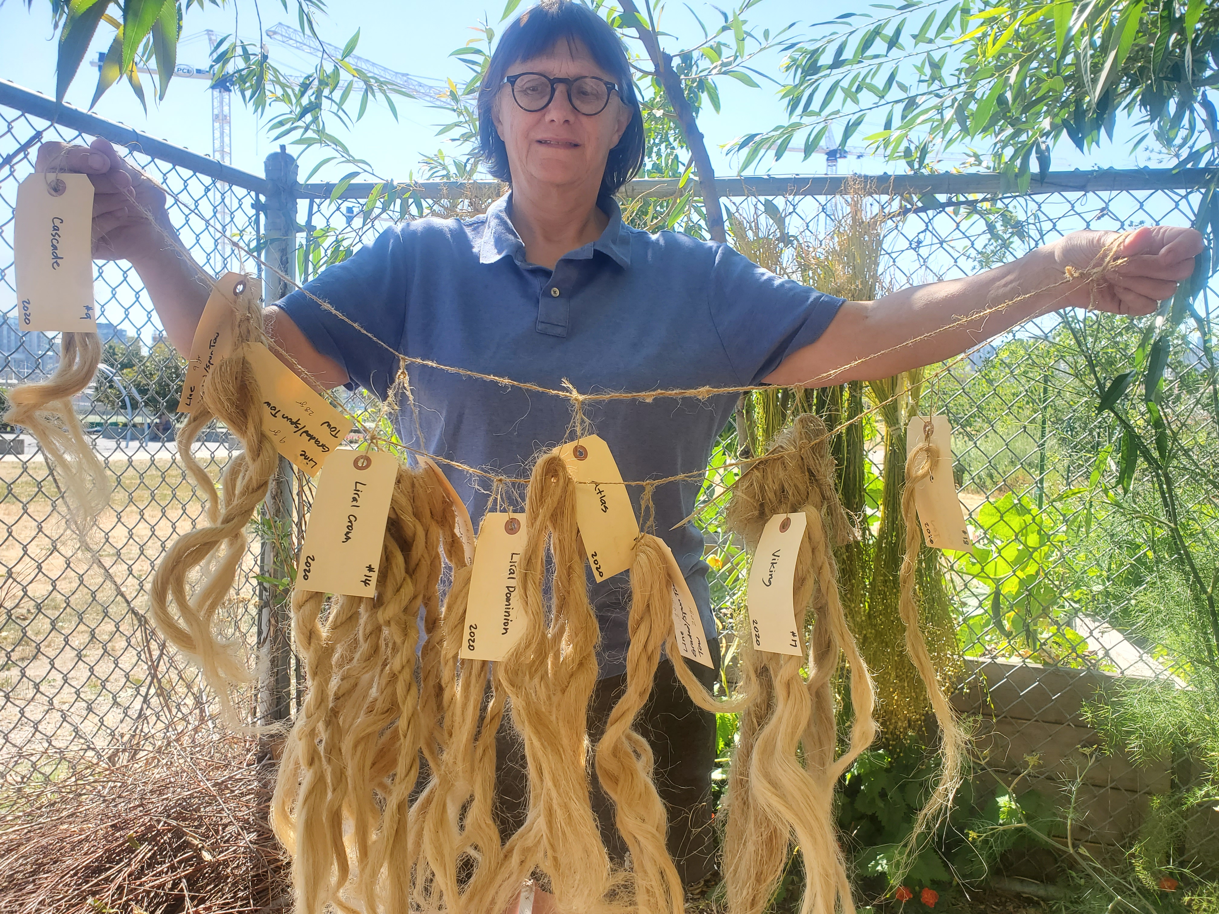 Our harvest event in Richmond was a beautiful, hot summer night and gave us reason to pull together the fibre samples from what Kathy Dunster has been growing in seed trials in her work with Kwantlen Polytechnic University. Our seed stalk has grown again thanks to the plot we were able to grow at the Kwantlen Richmond farm- and expect future weaving research using unbroken flax and other fibre work to come from this straw! If you are looking for your own BC seed source- we recommend reaching out to Carole Hyland at Alderley Grange Farm on Vancouver Island