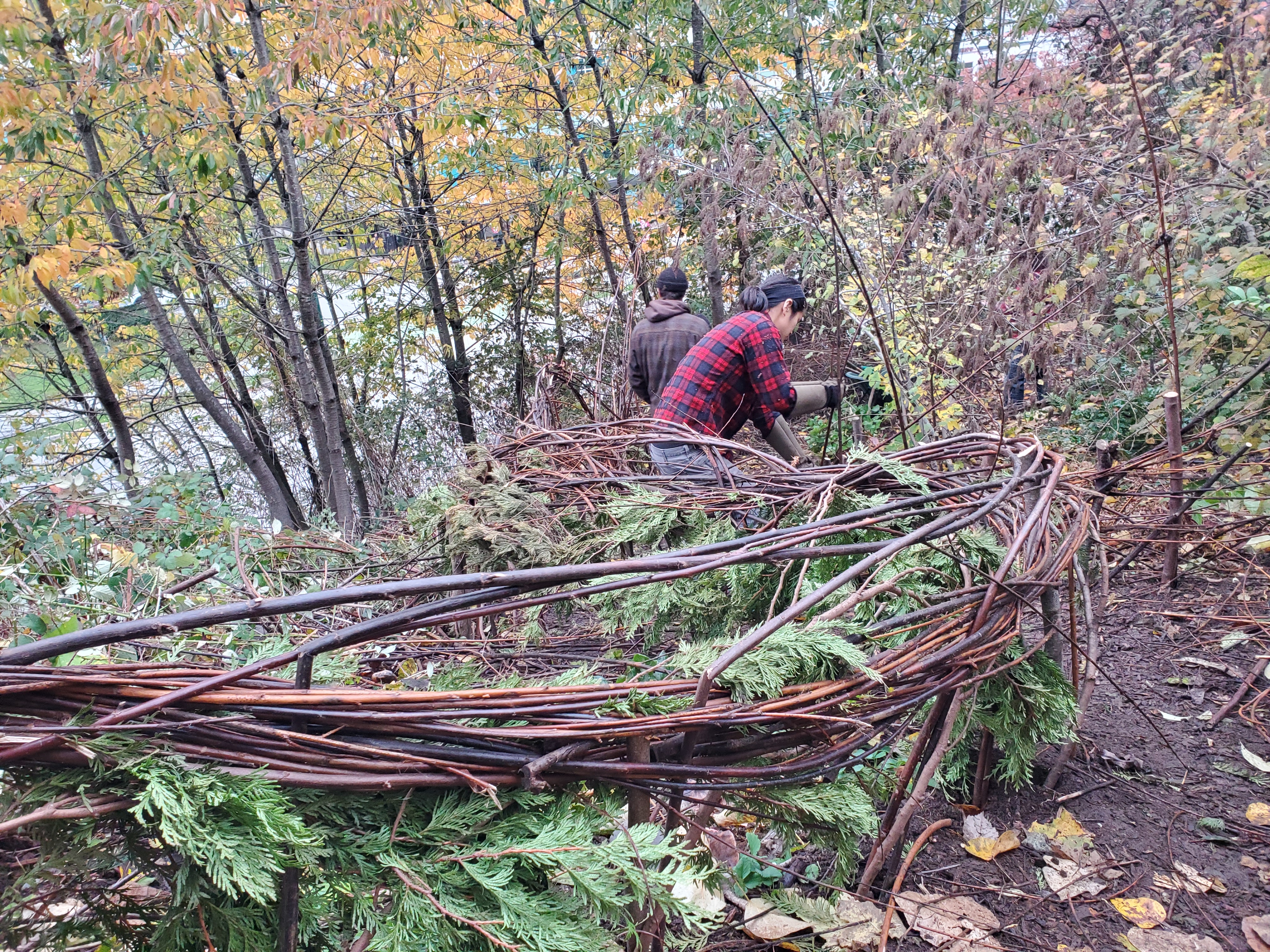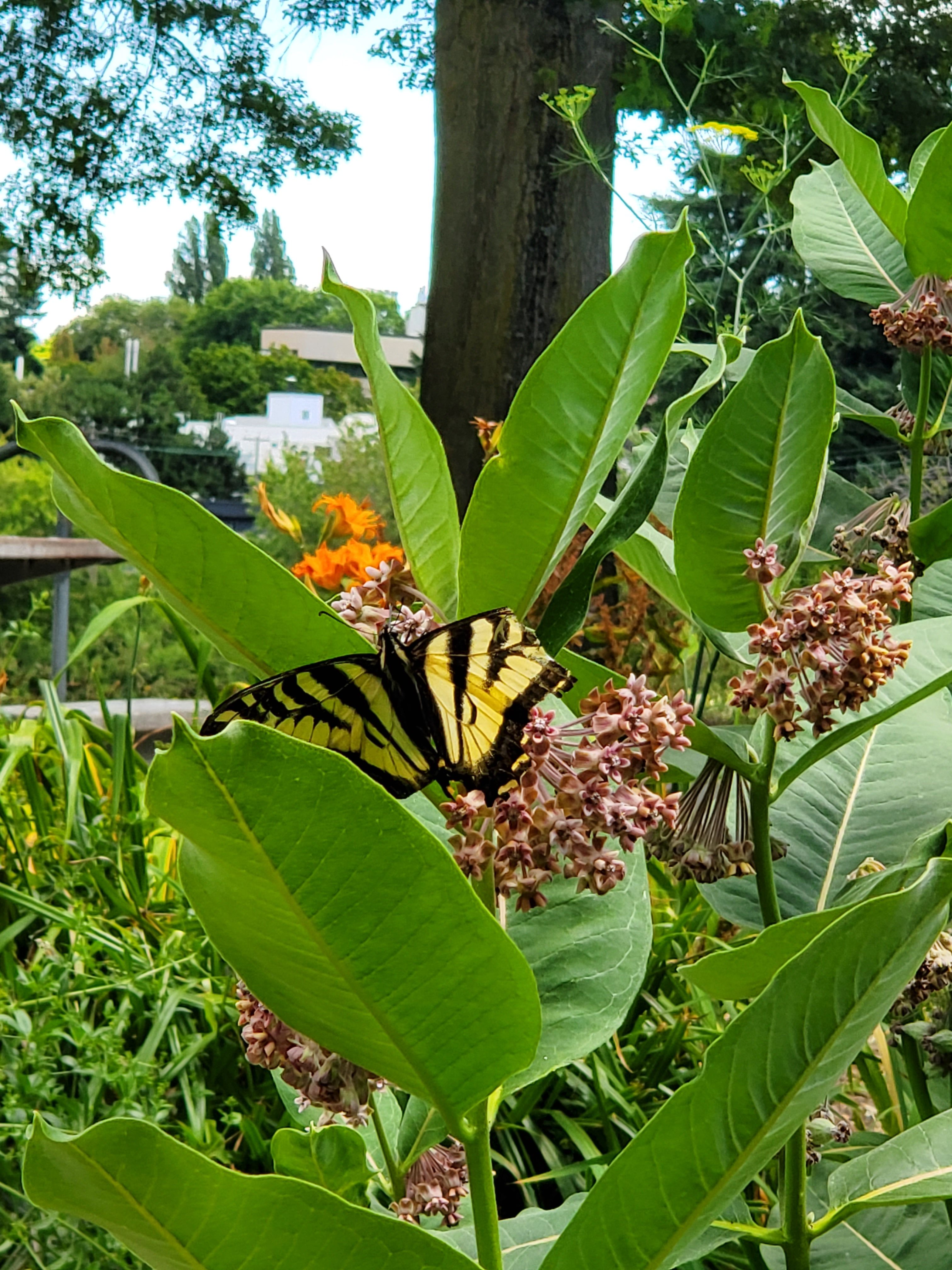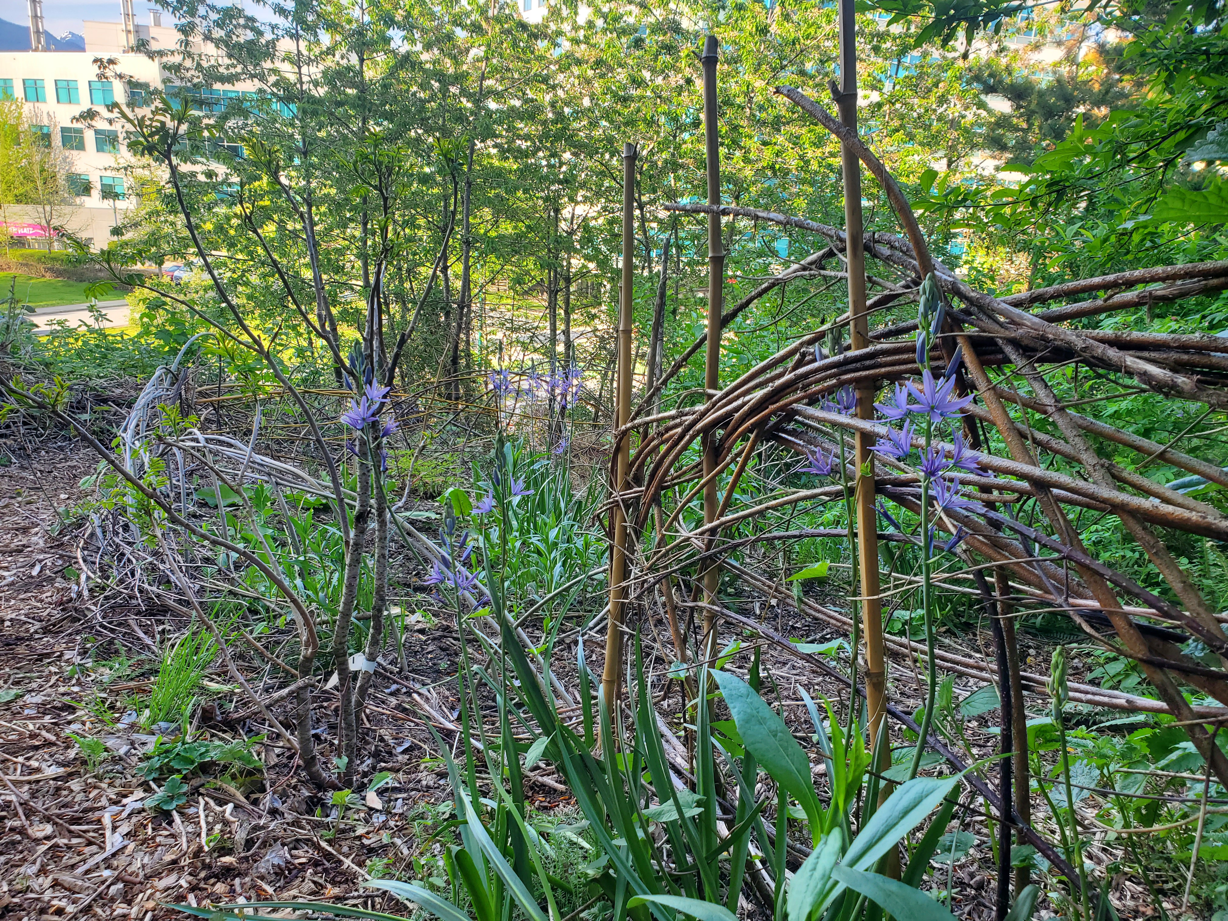 At the Means of Production garden, our weekly stewardship team did a fantastic job of opening up areas in the food forest orchard- removing non fruiting trees and planting more blueberries, the camas bloomed on the western hill we have been replanting from blackberry removal, and we got a new switchback trail terraformed, with a fence woven, fireweed seeded, and more blackberry removed! We will be keeping a ‘trained area” of the blackberries at neighbours request for the seniors that have a hard time making it down the hill. On the far East side, more planting has happened to establish our drought tolerant fibre hill, and in the top area, the milkweed is thriving and our resident raccoon seems happy too.