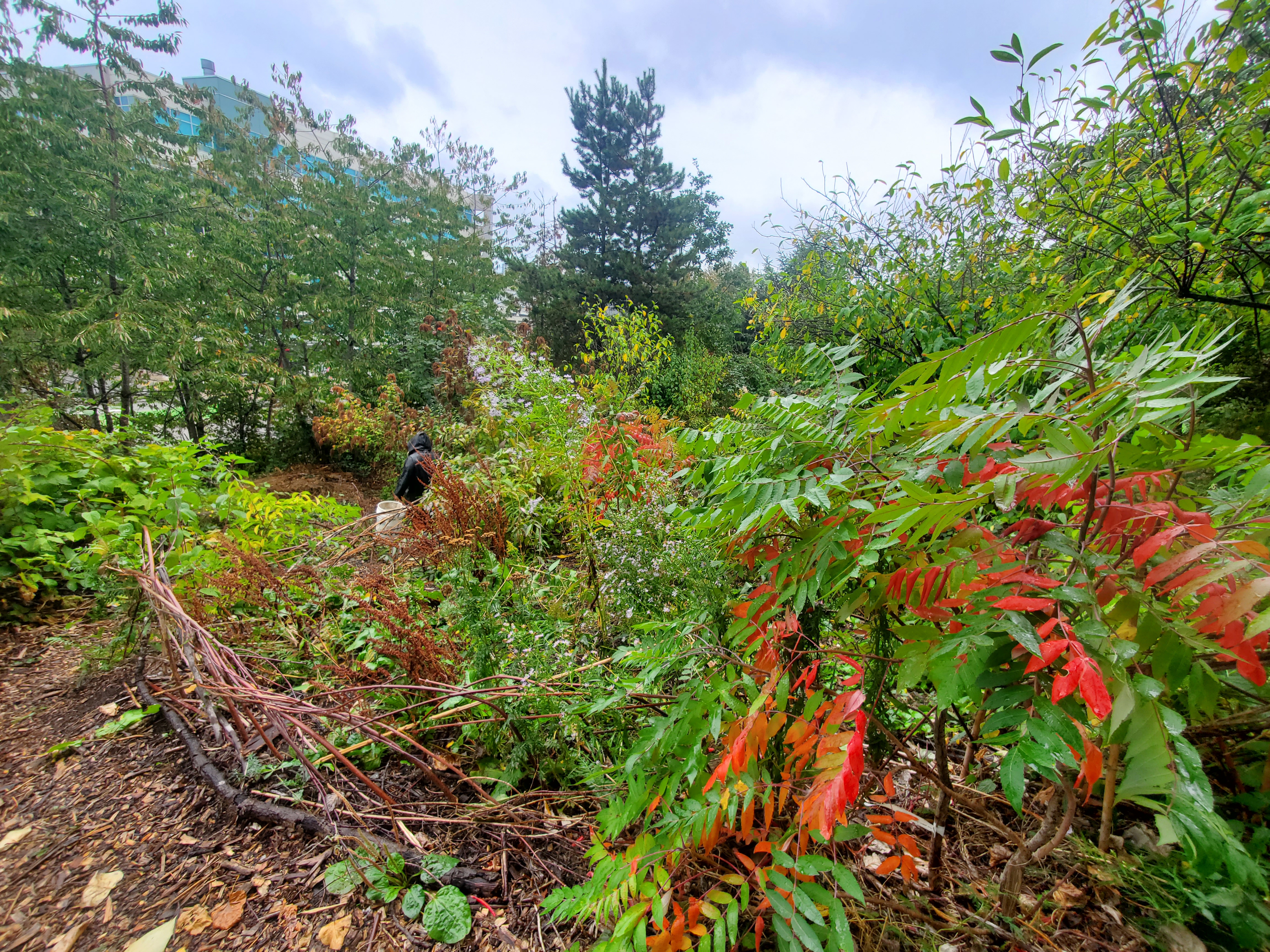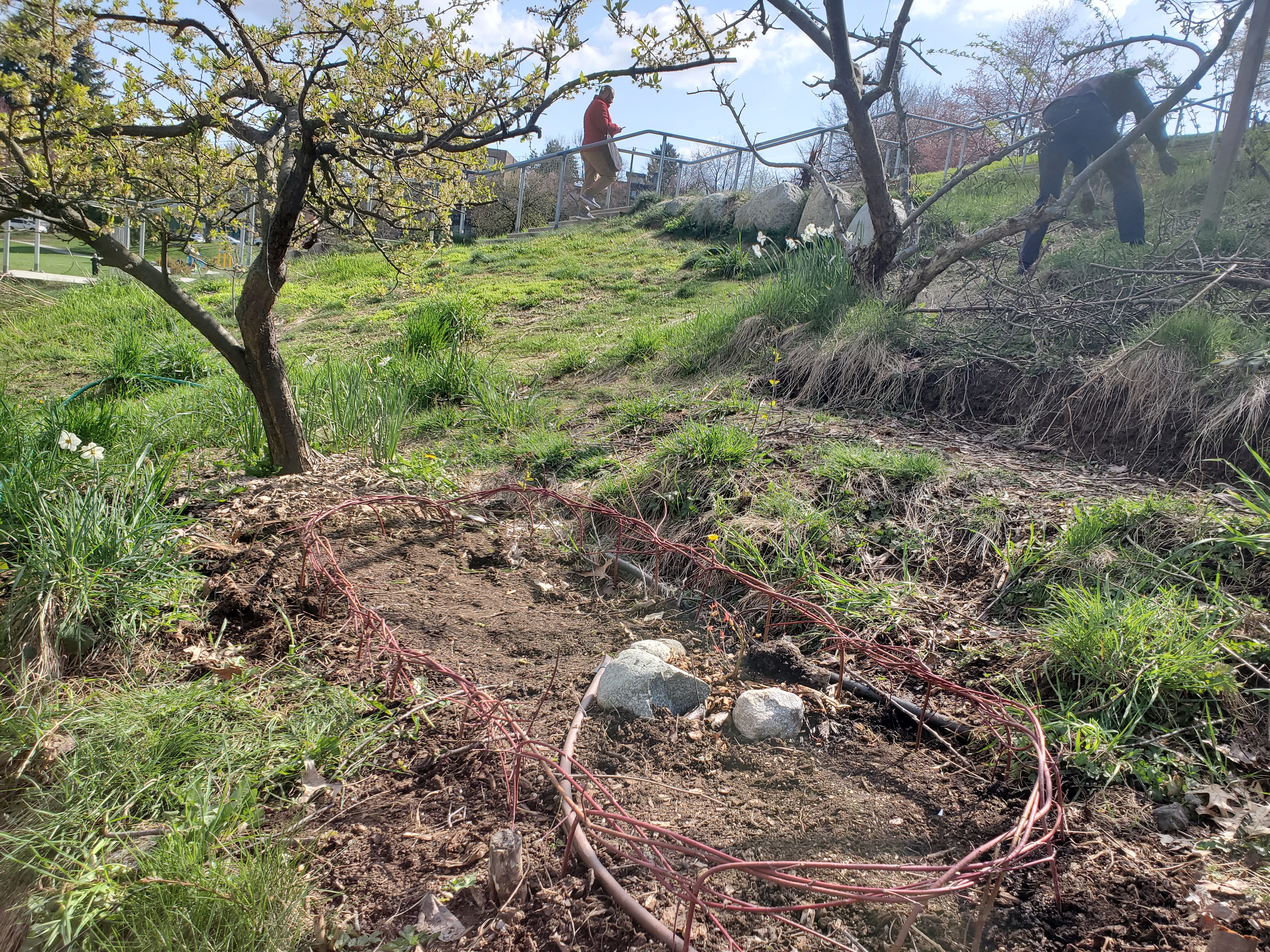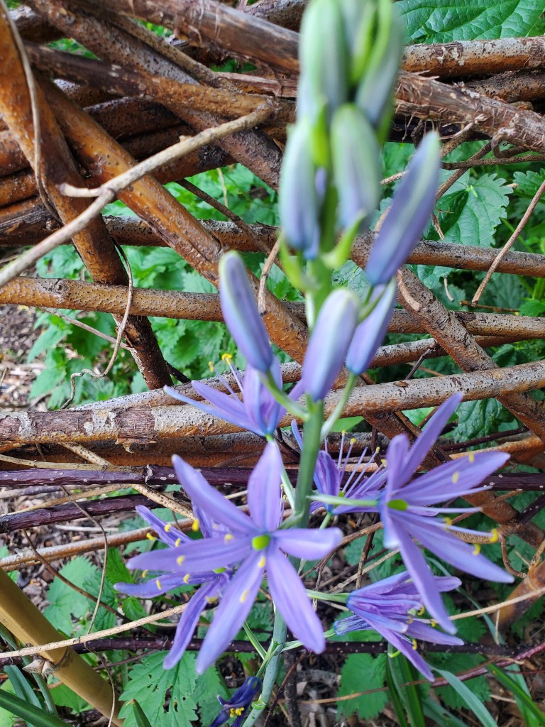 At the Means of Production garden, our weekly stewardship team did a fantastic job of opening up areas in the food forest orchard- removing non fruiting trees and planting more blueberries, the camas bloomed on the western hill we have been replanting from blackberry removal, and we got a new switchback trail terraformed, with a fence woven, fireweed seeded, and more blackberry removed! We will be keeping a ‘trained area” of the blackberries at neighbours request for the seniors that have a hard time making it down the hill. On the far East side, more planting has happened to establish our drought tolerant fibre hill, and in the top area, the milkweed is thriving and our resident raccoon seems happy too.