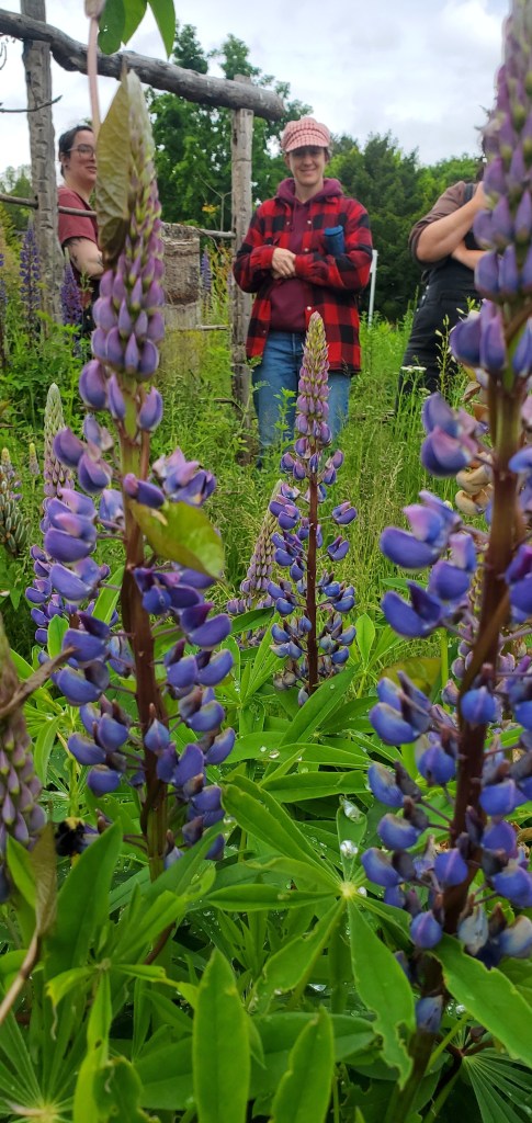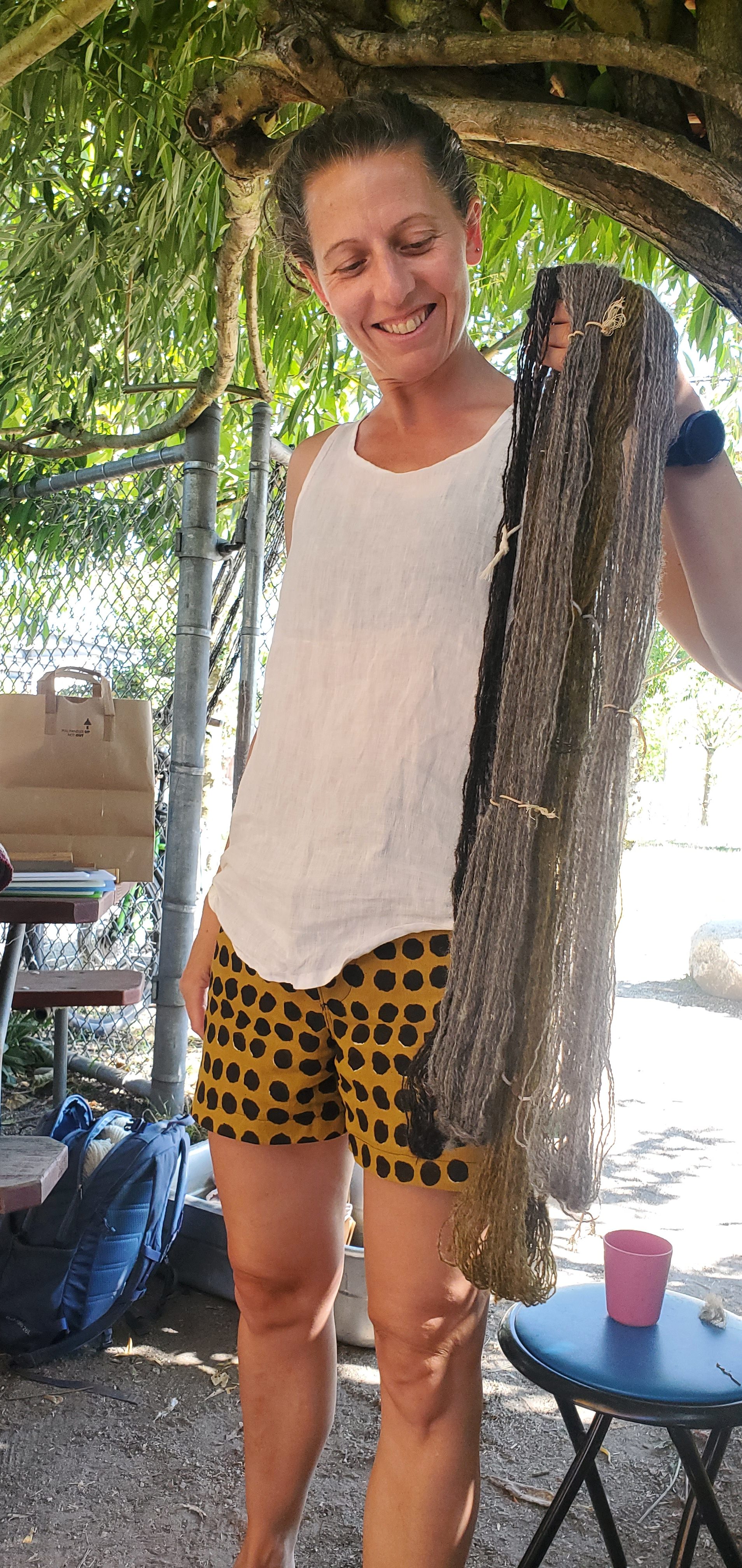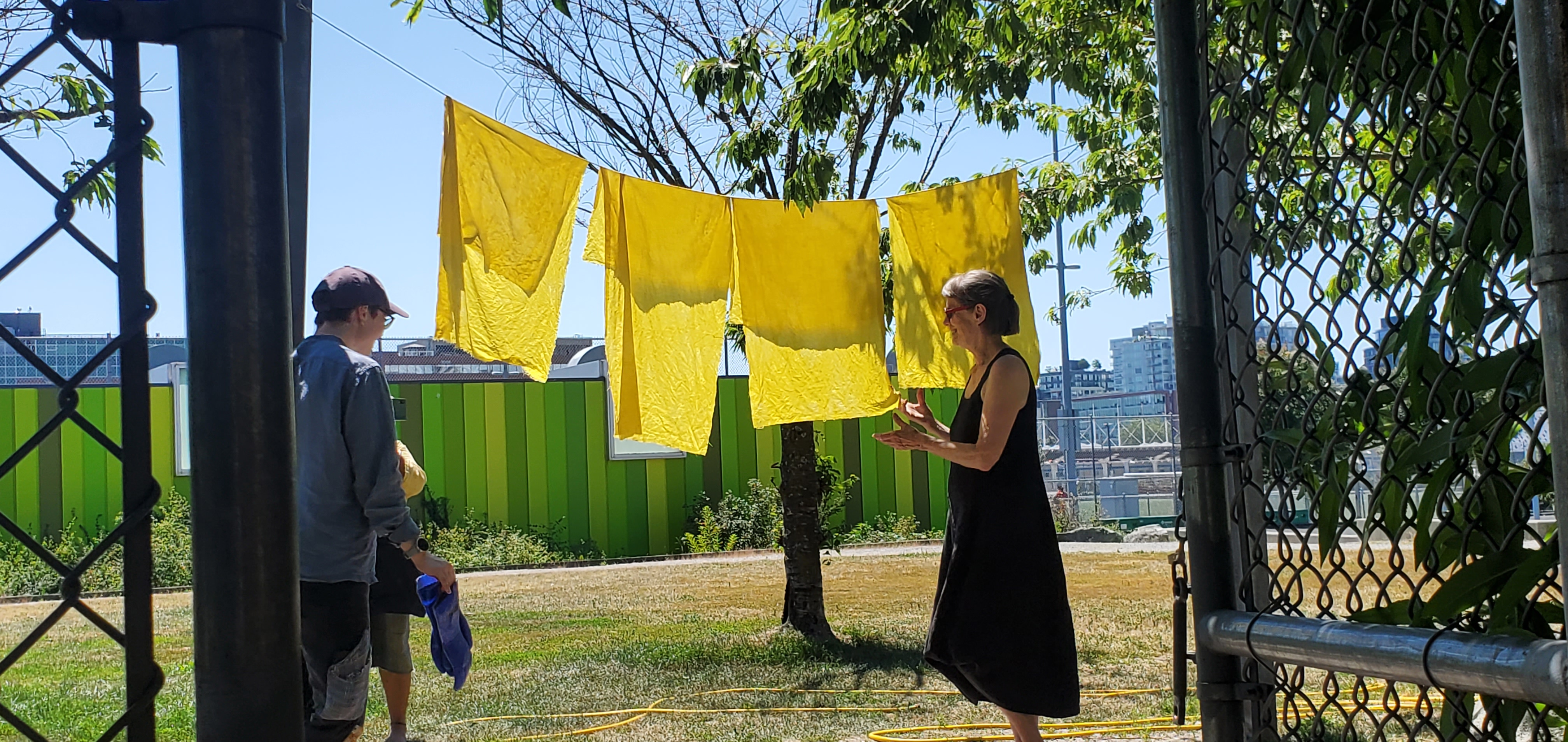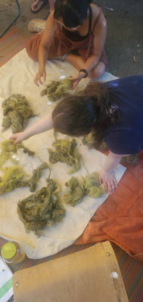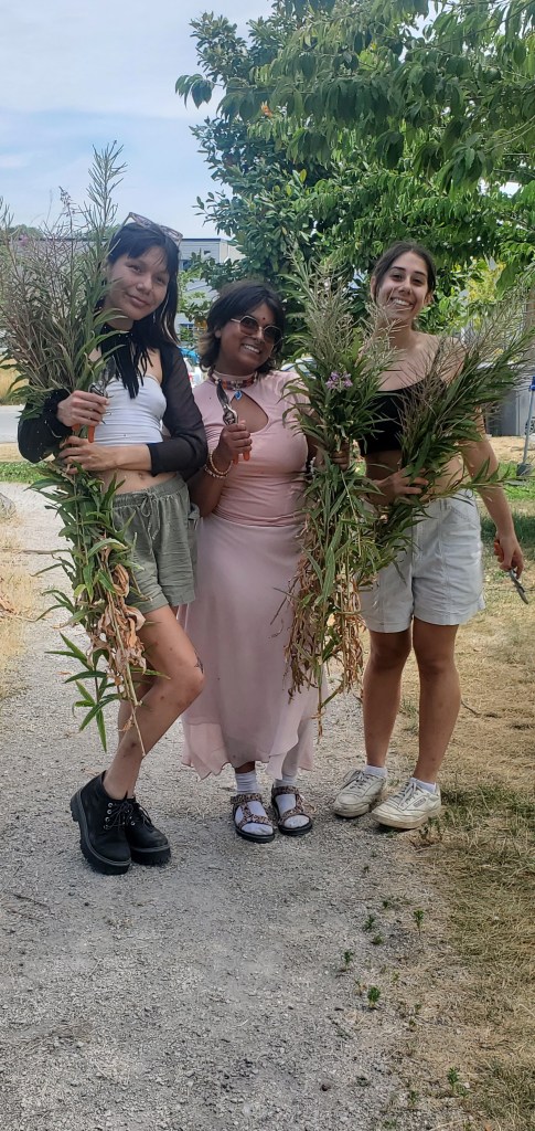 The Soil to Skin: Relational Clothing Cohort is meeting monthly with Sharon Kallis and collectively processing 4 fleeces, while sharing the labour (and some of the spinning), for local flax to become spun linen. The cohort is also active in tending plants during stewardship sessions that give us dye for our fibres. We have had a few side adventures into community, including helping the Sparrow family with salmon canning for the smoke house, helping at a mending night with Still Moon Arts Society, and participants will be present to help at future community events. It has been an incredible experience to witness the skills and strengths of the group come together, collectively making all the decisions for our collective- yet individual – colour range. There is an undercurrent of deep work happening here in practicing group decision making that will most certainly be brought forward into the Collective Land Care decision methodologies!