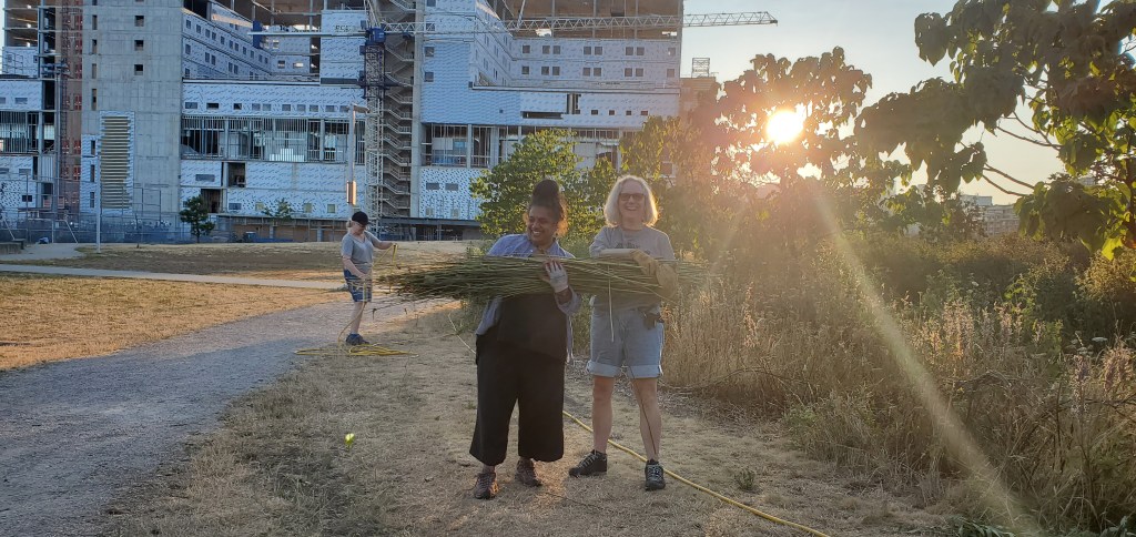 Our summer drop in open studios began the process of dying post consumer linen strips with plants from the gardens, and we are very excited at the test strips being woven by Corrina Hammond in her local studio as we to making mats as community gifts for a future project!