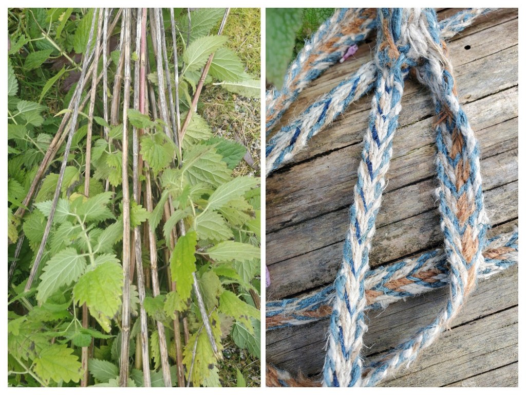 Early in her research into working with nettles, Sharon discovered that the fifty stalks of nettles she usually harvested and processed in a work session matched the amount noted by Franz Boas harvested and processed in a session by members of the Kwakiutl nation. Although various methods are possible for how to process and strip fibres, the commonality of gathering and processing 50 has inspired the notion of this project. The first session will focus on striping fibres- everyone assisting to make bundles of raw fibres and discussing individual existing skills and techniques we already carry that we might bring to the making of our 50 nettle object. Iron and tannin dye pots on our third session will give some colour variation for highlighting braid and weave patterns as the group begins the journey of exploring methods of tablet weaving and braiding to reveal what 50 stalks of nettle can become.