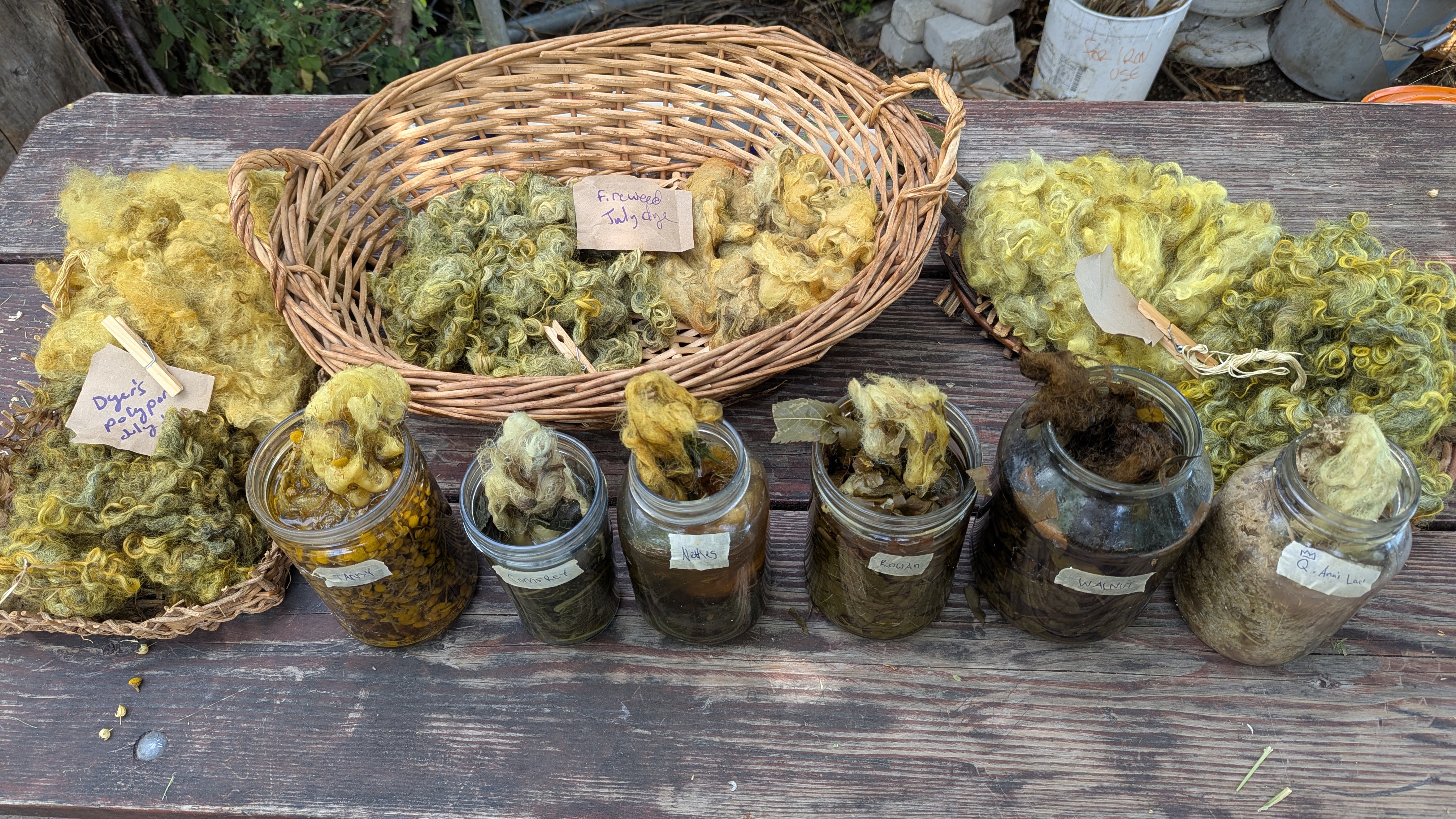A focus on spring greens, especially tansy pre-flower, offering a lovely range from soft cool yellows through to vibrant greens. Iron modifiers and dying portions of both a white and a grey fleece will give a full range of green heathered tones.