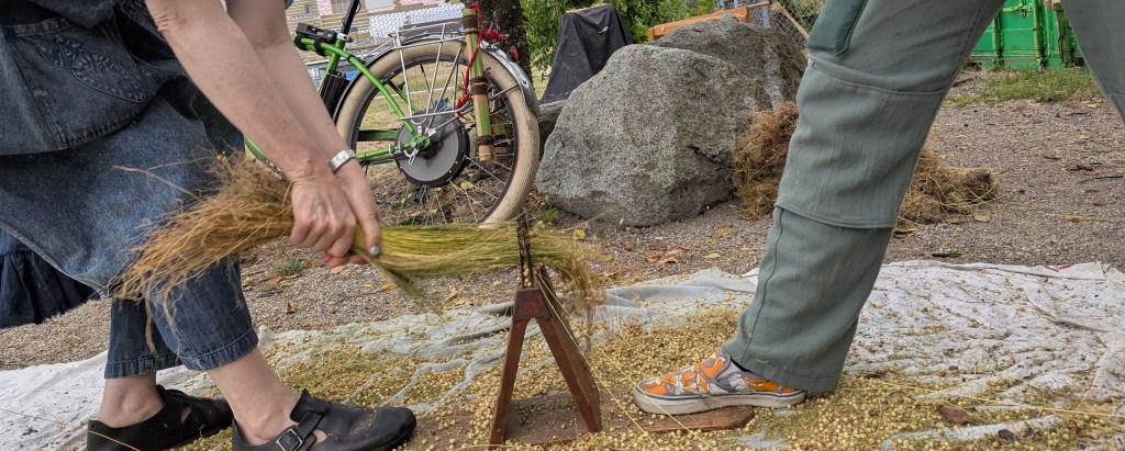 Six monthly sessions will take the 2026 Flax Cohort from planting flax seeds to spinning linen thread. Using 2025 heirloom flax grown at Kwantlen University as “learning flax”, participants will practice growing, tending, harvesting, retting, breaking, hackling, and spinning. This is an excellent opportunity to move through the seasons with our flax plants at Trillium, and gain familiarity with the full steps of processing straw to linen thread for weaving or knitting. Some experience in spinning is an asset but not a prerequisite; those new to spinning will have a steeper learning curve for spinning flax line. Anyone wishing to plant their own crops will be directed to local flax seed resources.