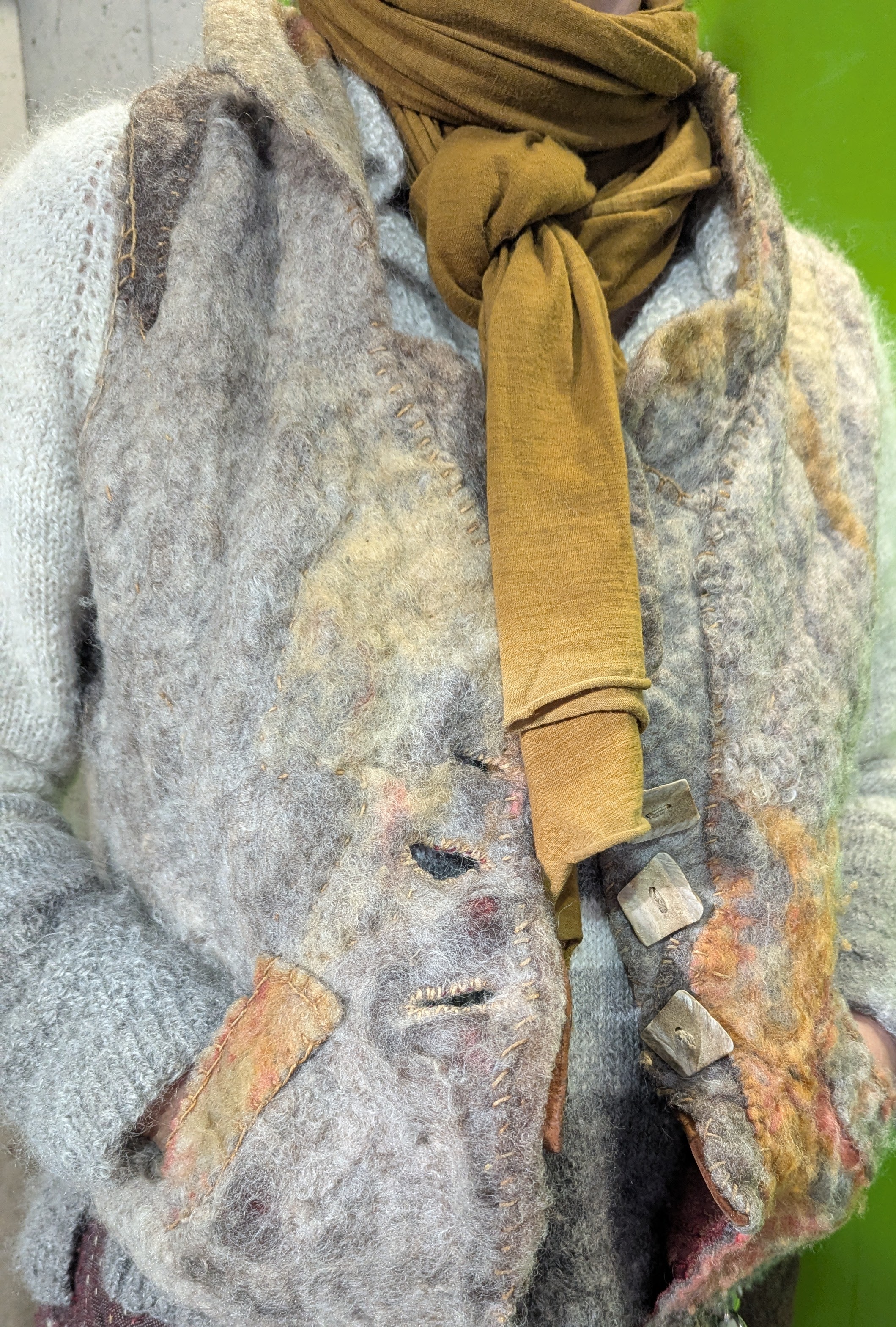 In subsequent sessions, participants bring their completed designs/patterns & we start wet felting the pattern pieces that will make up their vest.