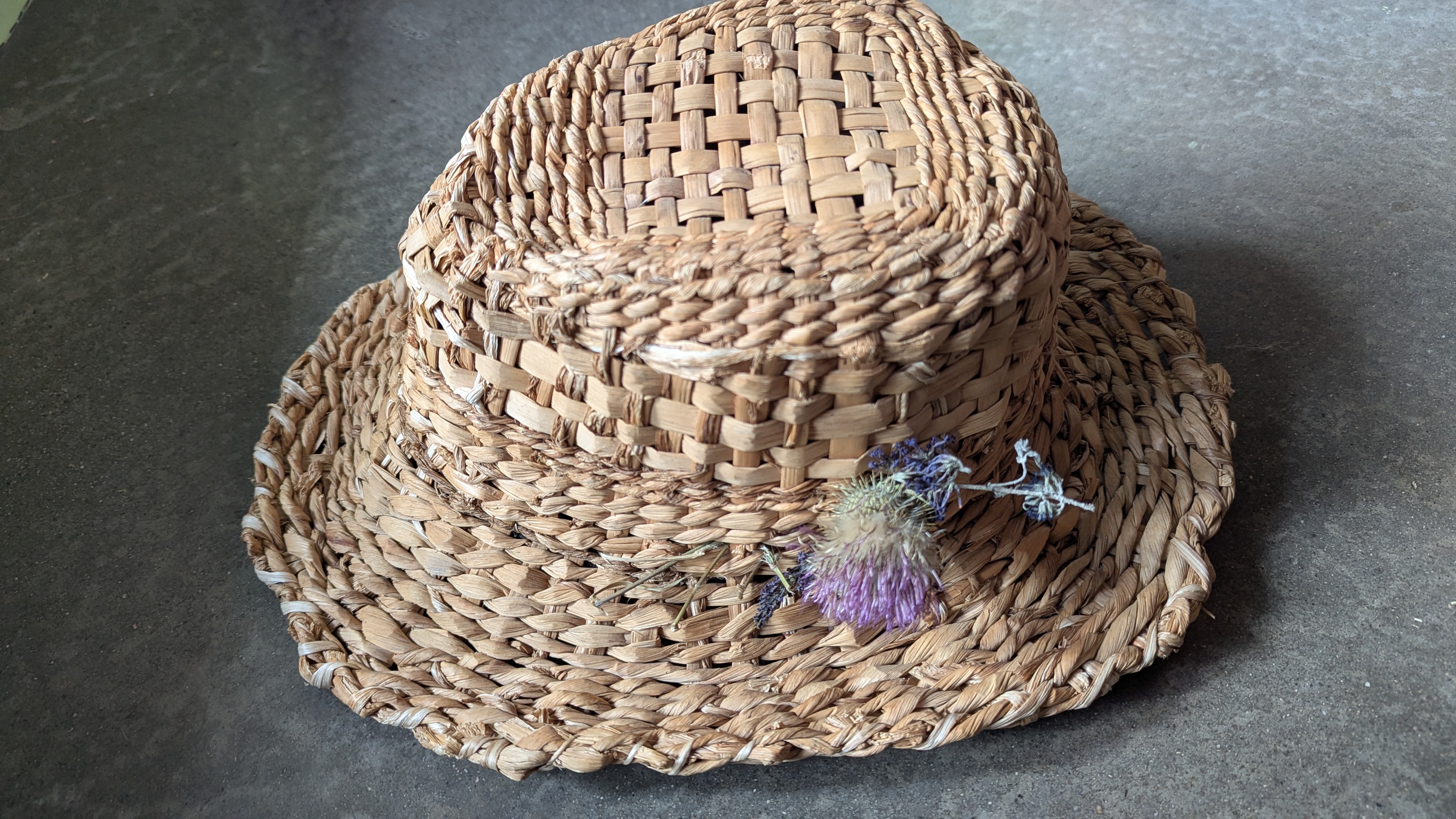 Using rolled bath towels for hatforms, we will weave flat oval form tops, build up the side walls of hats and continue through to simple brims of 2 to 3 inches for a ‘wide fedora’ type hat. Final shaping defines your brim curves and shape to complete your hat.